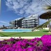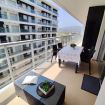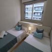 Apartamento con vista al mar en primera línea de playa. Ocupación de hasta siete personas, con tres habitaciones, dos baños, dos piscinas y tres jacuzzis comunitarios, jardín, parking privado y parque infantil.